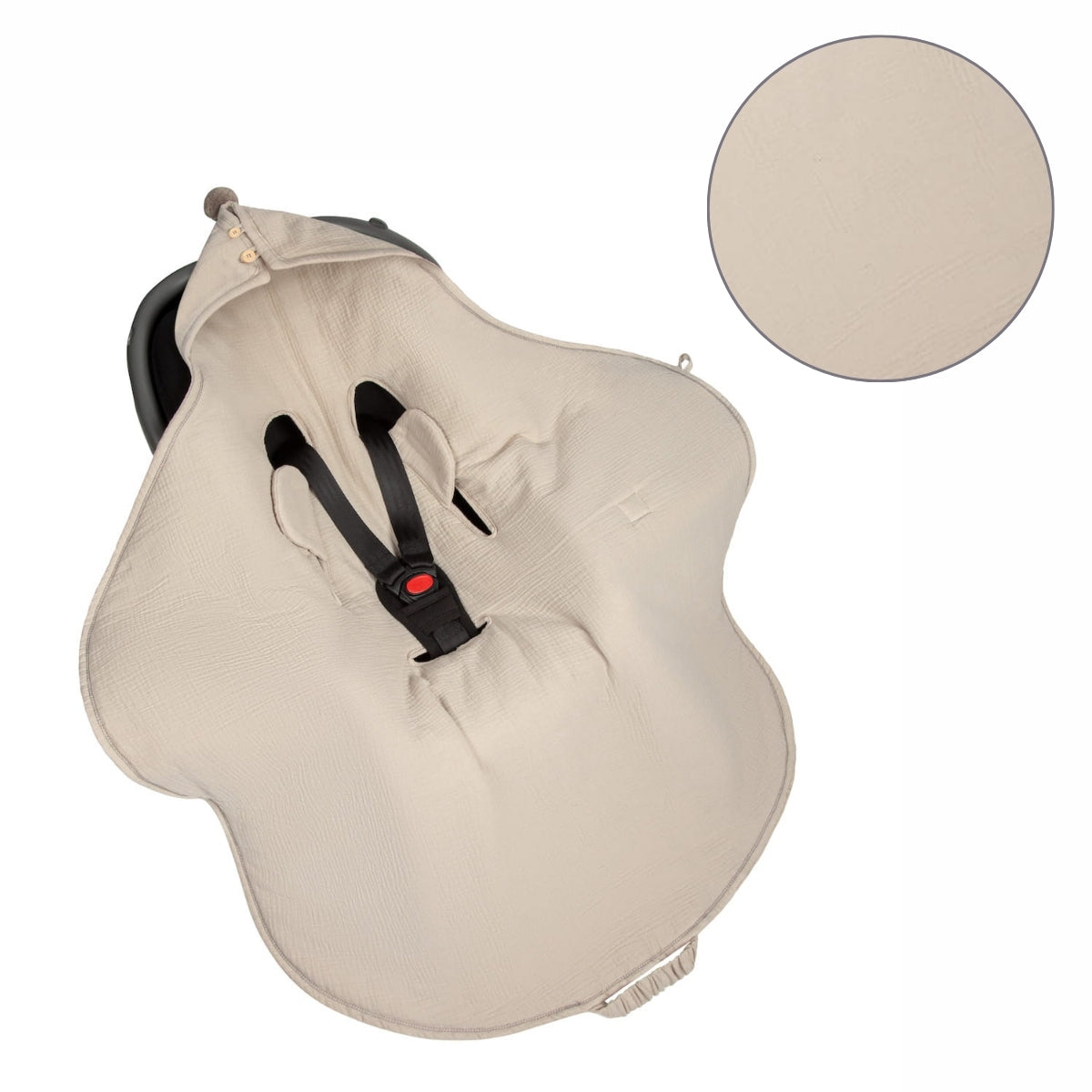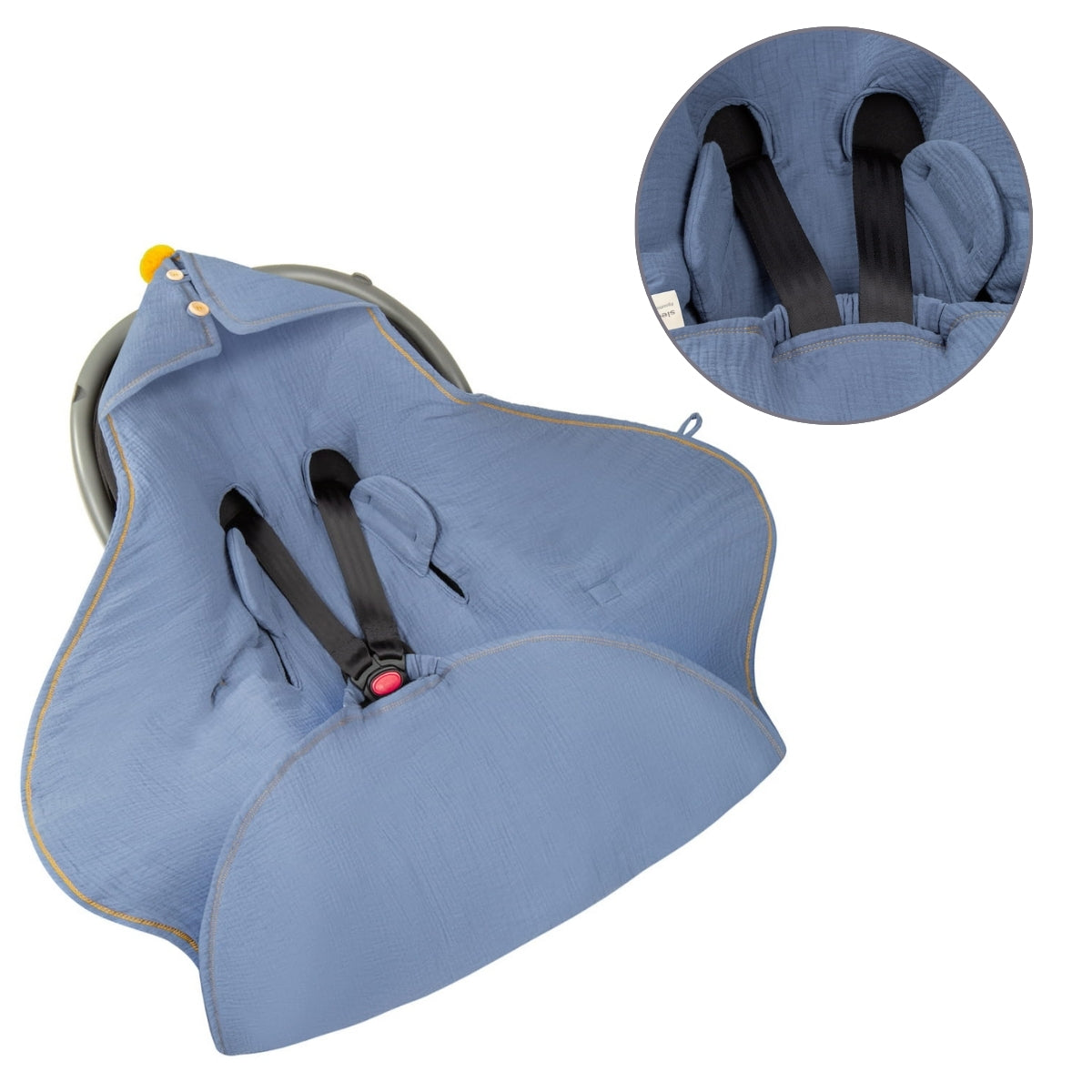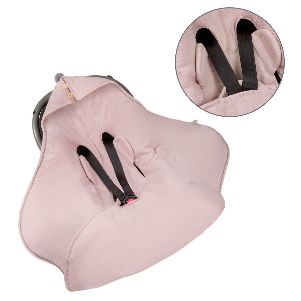 Versatilidad y Conveniencia: Se adapta a todos los asientos de coche, carriolas y mecedoras con cinturones de 3 y 5 puntos, lo que lo hace excepcionalmente práctico.