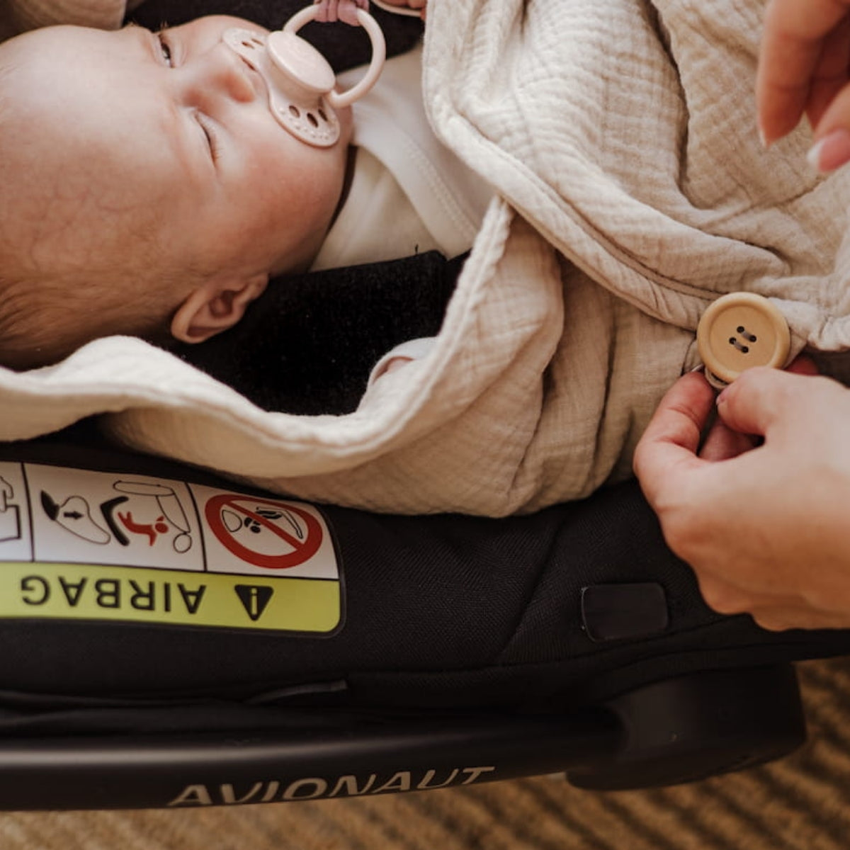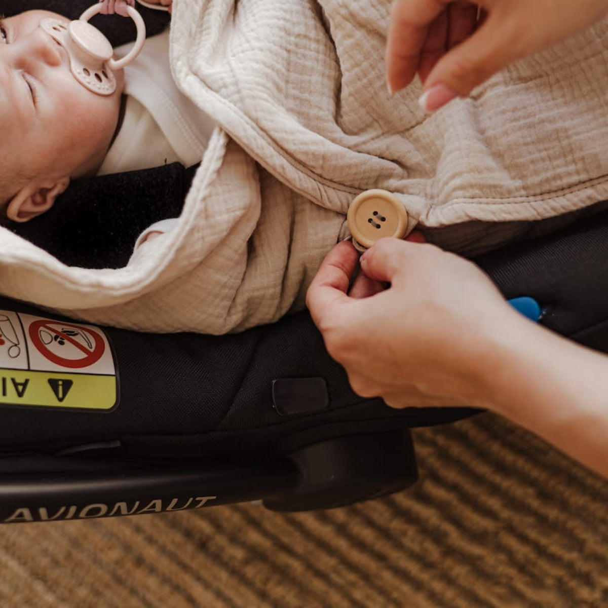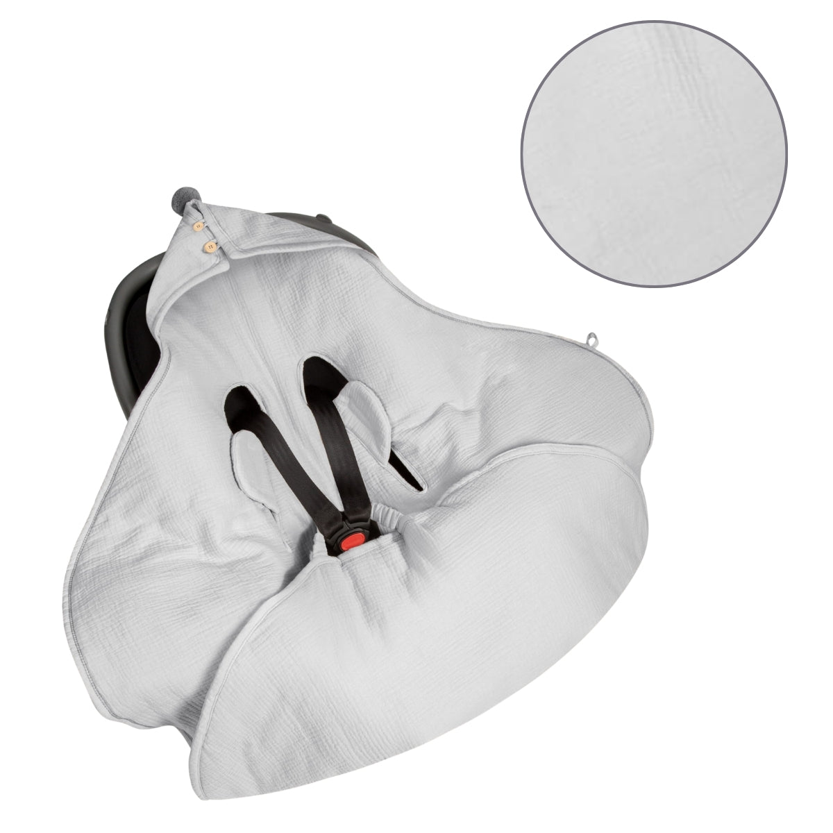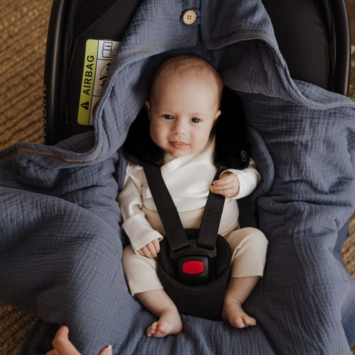 Versatilidad y Conveniencia: Se adapta a todos los asientos de coche, carriolas y mecedoras con cinturones de 3 y 5 puntos, lo que lo hace excepcionalmente práctico.